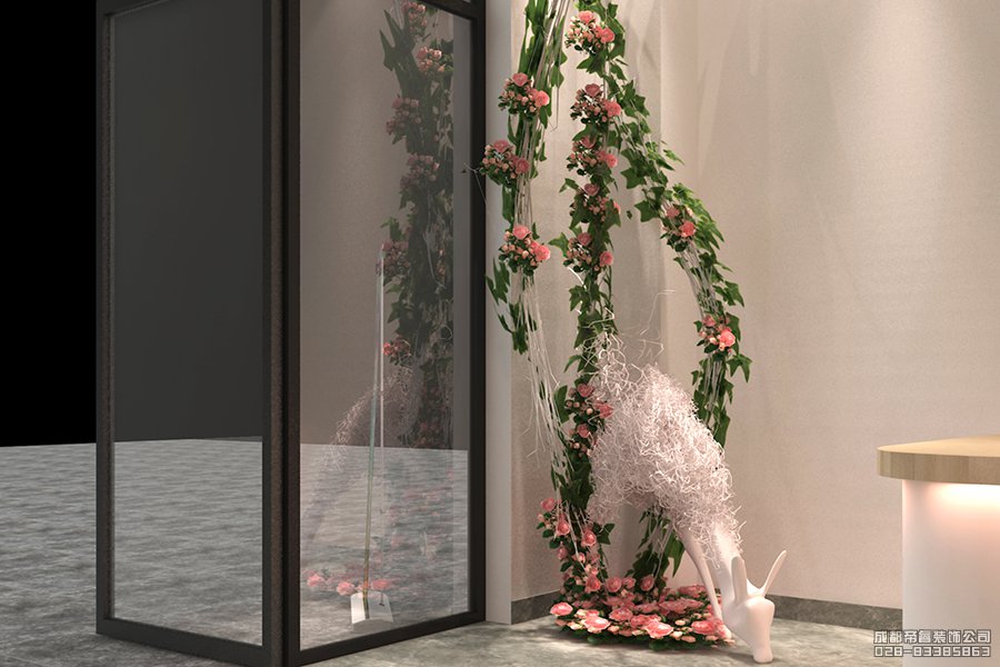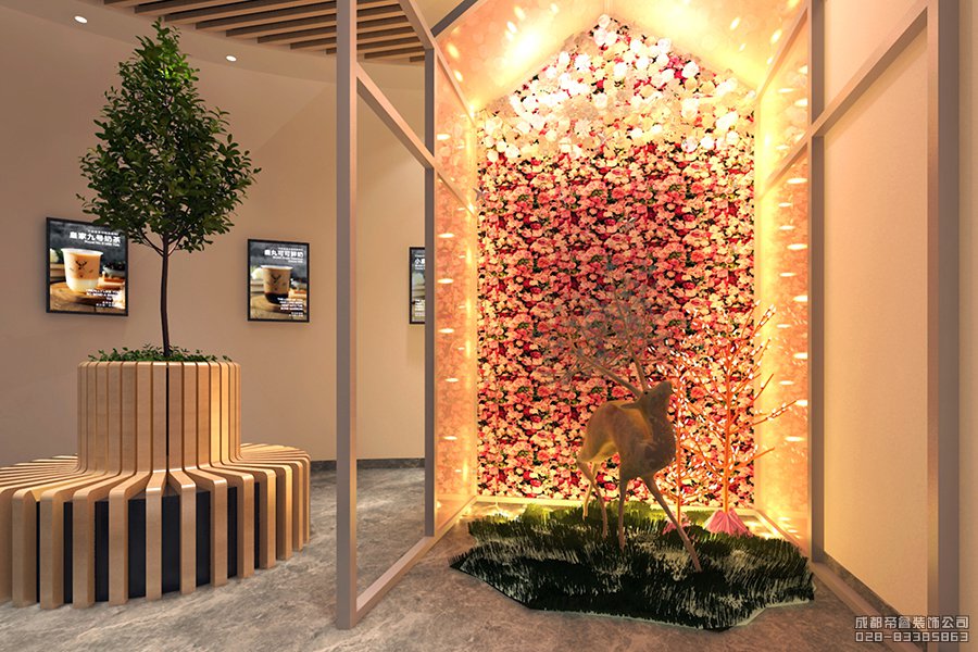 而在奶茶店休息區(qū)的另一角則是設(shè)計(jì)了一個(gè)獨(dú)立景觀空間,里面密密麻麻的裝飾著鮮艷花朵,再配以“白鹿”這種有著品牌意義的吉祥物,很好的詮釋了連鎖奶茶店鹿角戲這個(gè)品牌形象,同時(shí)也寓意著這是一家高端連鎖奶茶店。